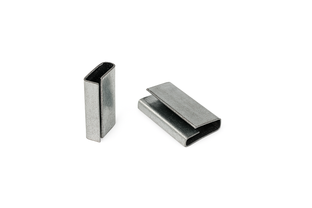 Sello /unión de acero abiertos para la sujeción de flejes de PET para herramientas manuales.